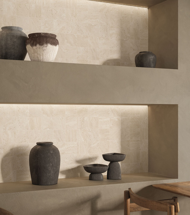 Dual Travertin van Emilceramica laat één materiaal op twee manieren zien. Poro Aperto: een authentieke tegel met open, natuurlijke poriën. De structuur van travertin blijft puur en echt. Poro Chiuso: een gepolijste en compacte tegel. De poriën zijn gevuld met een voeg in dezelfde kleur. Het oppervlak oogt strak en elegant. Verkrijgbaar in White en Beige, in vele formaten. Ook is er een decor, bricks, mozaïeken en een unieke ronde kolomtegel. Geschikt voor residentiële en commerciële ruimtes.