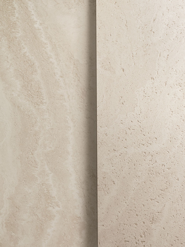 Dual Travertin van Emilceramica laat één materiaal op twee manieren zien. Poro Aperto: een authentieke tegel met open, natuurlijke poriën. De structuur van travertin blijft puur en echt. Poro Chiuso: een gepolijste en compacte tegel. De poriën zijn gevuld met een voeg in dezelfde kleur. Het oppervlak oogt strak en elegant. Verkrijgbaar in White en Beige, in vele formaten. Ook is er een decor, bricks, mozaïeken en een unieke ronde kolomtegel. Geschikt voor residentiële en commerciële ruimtes.