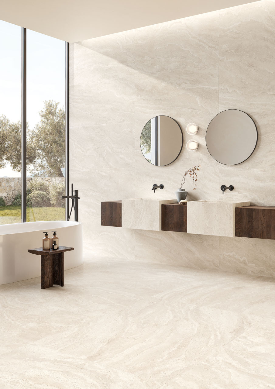 Dual Travertin van Emilceramica laat één materiaal op twee manieren zien. Poro Aperto: een authentieke tegel met open, natuurlijke poriën. De structuur van travertin blijft puur en echt. Poro Chiuso: een gepolijste en compacte tegel. De poriën zijn gevuld met een voeg in dezelfde kleur. Het oppervlak oogt strak en elegant. Verkrijgbaar in White en Beige, in vele formaten. Ook is er een decor, bricks, mozaïeken en een unieke ronde kolomtegel. Geschikt voor residentiële en commerciële ruimtes.